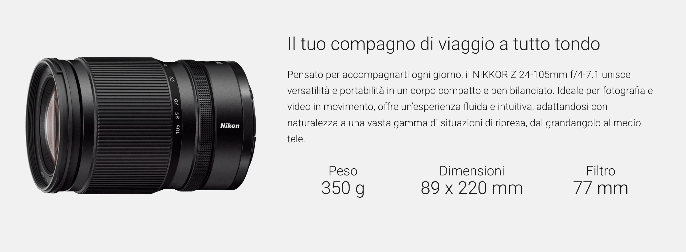 Progettato per l’avventura quotidiana, il NIKKOR Z 24-105mm f/4-7.1 è l’obiettivo all-around ideale per chi cerca leggerezza, versatilità e libertà creativa. Compatto, resistente a polvere e umidità e perfettamente bilanciato con le fotocamere mirrorless Nikon Z, è pronto ad accompagnarti ovunque. Dallo scatto spontaneo al video in movimento, offre un’esperienza fluida e intuitiva, con la flessibilità giusta per raccontare ogni momento, anche nei dettagli più ravvicinati.