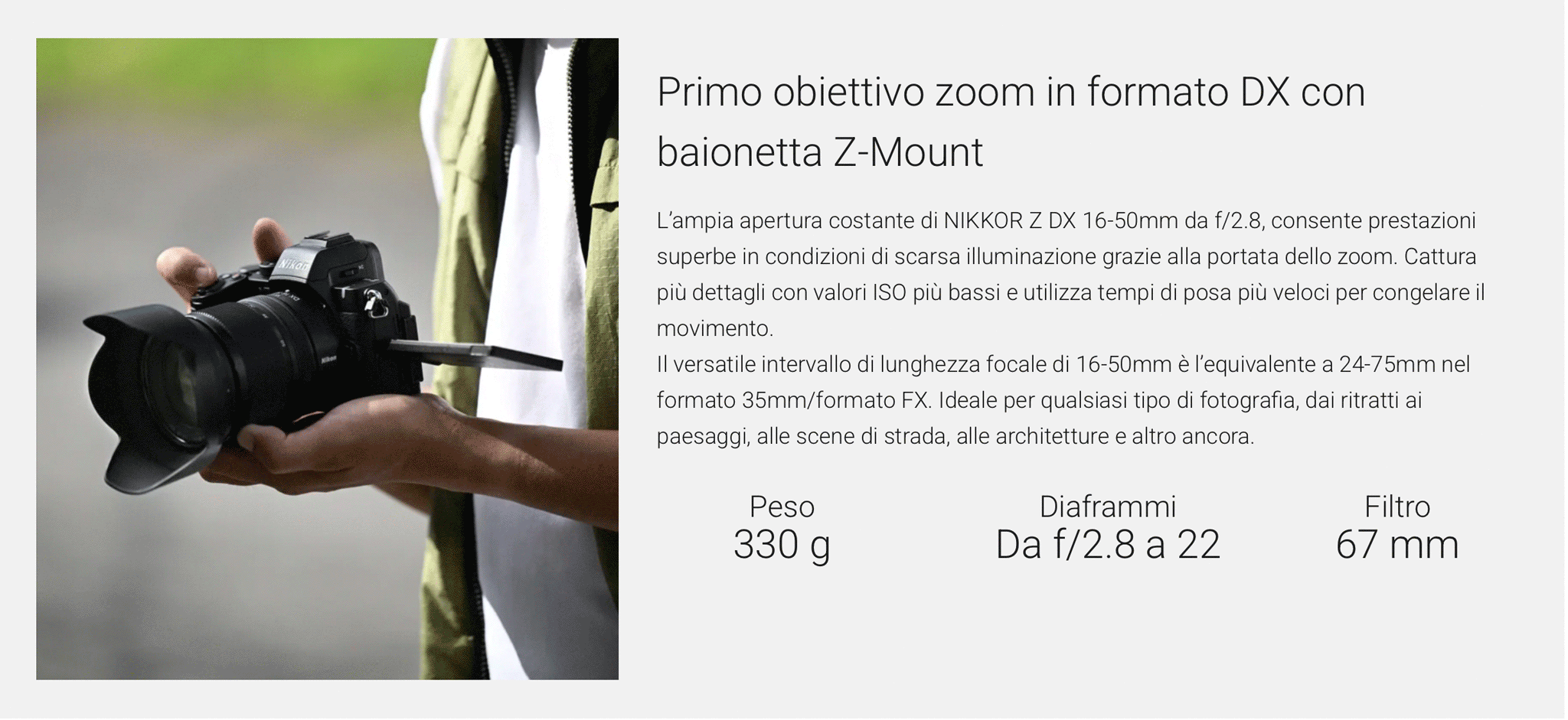 Compatto, versatile e incredibilmente luminoso, questo obiettivo zoom ti lascia piena libertà creativa. Con la sua escursione focale da 16 a 50mm (equivalente a 24–75mm nel formato 35mm/FX), puoi sperimentare prospettive diverse e catturare ogni scena con la massima flessibilità.